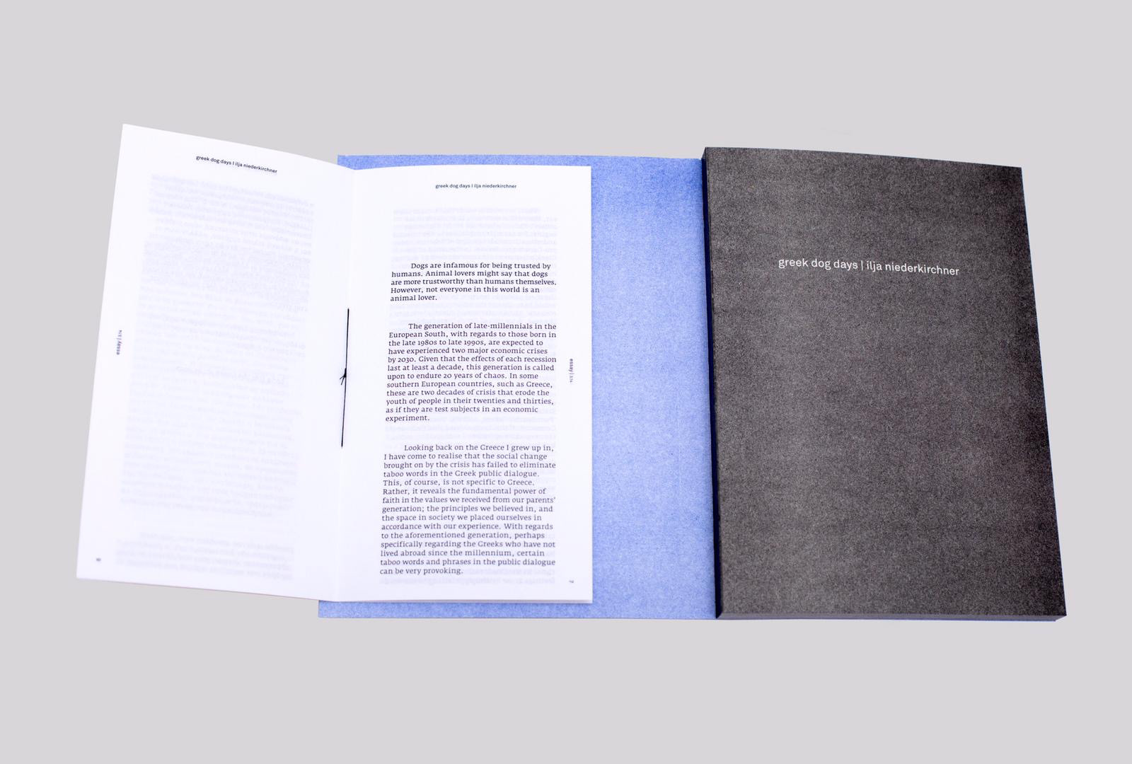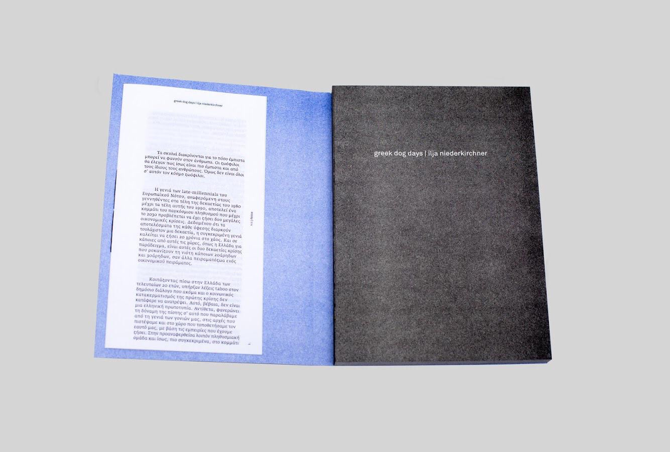 "[...] Most images depict abandoned houses with broken windows, unfinished building constructions, shut-down businesses, empty billboards or out-of-order petrol stations. In this post-apocalyptic world, humans are absent and only stray dogs wander the streets, looking at times back at the camera, surprised to find another species in such a wasteland. Tragically, these dystopian-like scenes are by no means fictional. Through its dozens of pages, Ilja Niederkirchner presents the urban relics of post-crisis Greece, with the yet unhealed wounds of its bleeding economy. [...]" - Dr. Paula Gortazar @paulagortazar for @c4journal "[...] A noir-ish insight into the effects of the Greek economic crisis on the urban landscape. Really nice work that grows on you in its simplicity and sincerity. [...]" - Sunil Shah @sunilphoto " [...] Greek Dog Days, however, goes beyond a mere documentation of the catastrophe. The publication points at its causes, aiming for action, clamouring for a revolution. [...]" - Dr. Paula Gortazar @paulagortazar for @c4journal